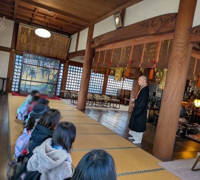 まず本堂でお参りをし、ご住職のお話を聞かせていただきました。その後、中国のあたたかいお茶をふるまっていただき、みんなでゆっくり味わうことで、 心もからだもぽかぽかに温まりました。